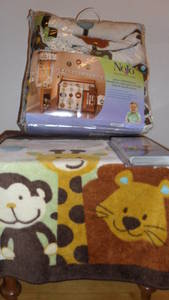 我兒子不睡小床,只跟我說,所以整組幾乎沒有用過,有整套棉被,保護四周的bumper,床的裙子,床單還有搭配的貼紙。