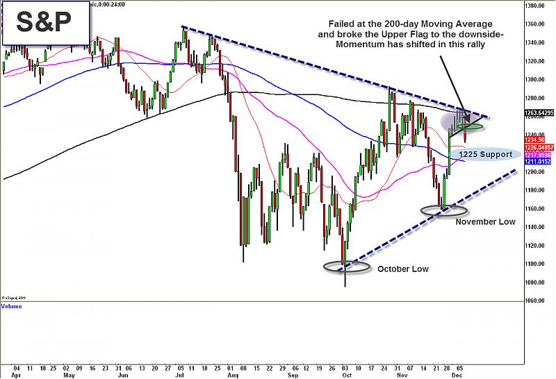 The break of the upper level flag took short-term momentum out of the rally. When you trade for momentum, you need to act quick and take losses once that momentum leaves. IF you are holding longer-term for a macro move, the overall pattern is still intact for higher prices, but will take more time. This headline driven market is frustrating a lot of traders as there is no follow through. It is a very choppy, dangerous environment right now. 1225 is the 38.2% fibonacci retracement level. 1213 is the 50% retracement level.