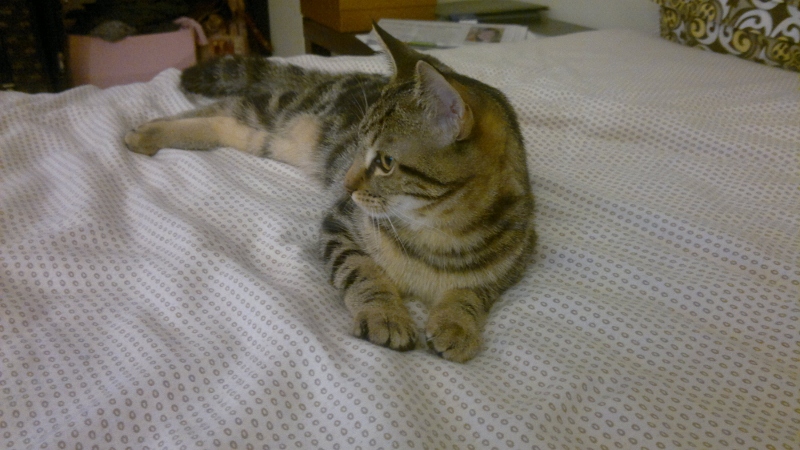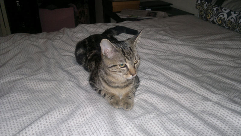 几个月前从外面捡的一只小猫,她叫球球,回来的时候不到一个月大,现在差不多六个月大了吧,我们家现在已经有两只猫了,实在照顾不过来,所以,想找个对她好的朋友照顾她,她是一只母猫,因为从外面捡来的,所以还没有节育