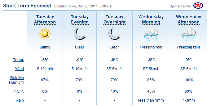 A low pressure system originating in Texas is forecast to track over Lake Ontario Wednesday evening. Precipitation ahead of this low will spread into Southern Ontario early Wednesday morning and reach the National Capital Region by Wednesday noon. The precipitation will encounter colder air in Eastern Ontario and will likely begin as snow or freezing rain. The precipitation is expected to change over to rain after a few hours over regions near the Kawarthas and Haliburton Highlands. However regions near the Ottawa River could experience an extended period of freezing rain of 6 hours or more. Freezing rain amounts will likely be a few to possibly 5 millimetres. The precipitation is expected to taper off in Eastern Ontario late Wednesday evening.