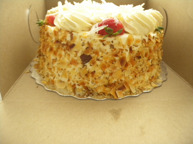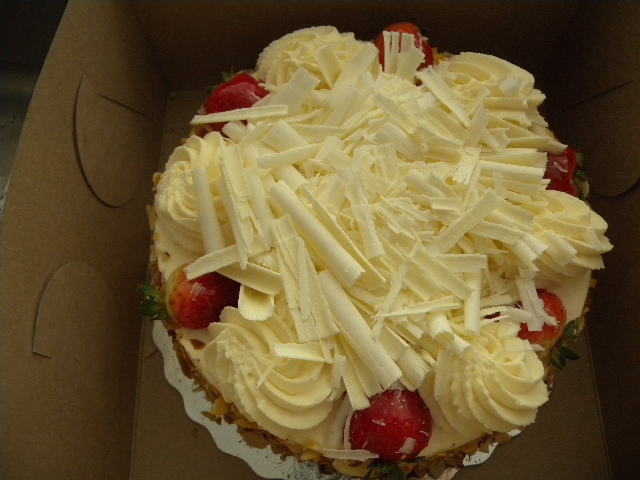 看上去有白巧克力,草莓,杏仁,whipping cream。