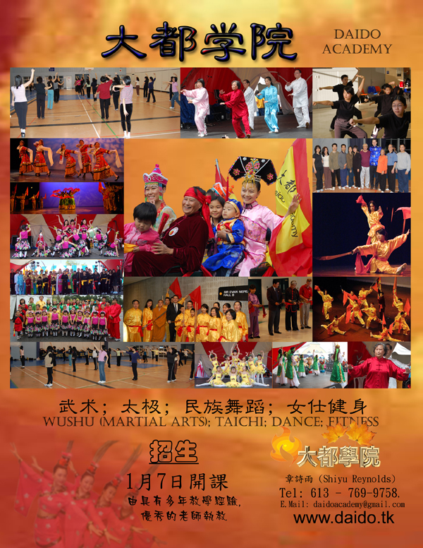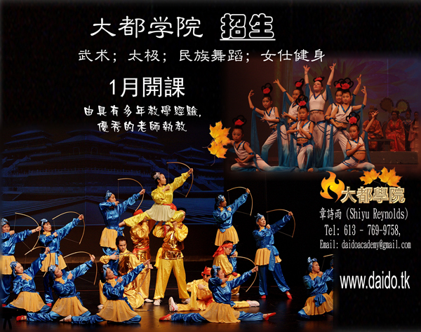 大都學院將于2012年1月7日, 1月8日, 和1月10日開學,提供儿童,青少年舞蹈,武術,太极, 民族舞,女子健身舞等課程。欢迎大家报名参加。