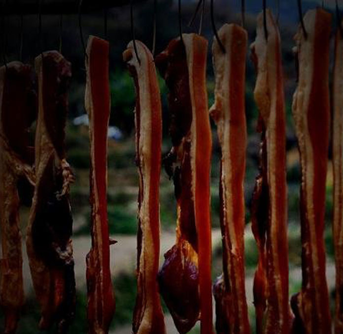 把买来的生肉切断,放在大的汤锅里,老抽浸没加盐,糖,料酒,花椒,根据个人口味不同,你可以试一下这个料来决定。充分混合,搅拌,翻面,然后放冰箱24小时,拿出来,肉穿孔,用绳子吊起,你会看到这块肉是黑的。现在的天气放车库7天,记住一定要放纸板在地上,防止酱汁下落。7天后,你会看到肉变干了。说明成功,可以吃了。