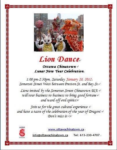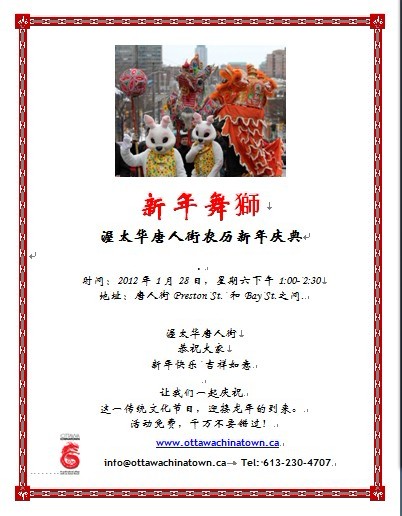 新年舞獅 渥太华唐人街农历新年庆典 时间:2012年1月28日,星期六下午1:00- 2:30 地址:唐人街Preston St. 和Bay St.之间. 渥太华唐人街 恭祝大家 新年快乐 吉祥如意 让我们一起庆祝 这一传统文化节日,迎接龙年的到来。 活动免费,千万不要错过!