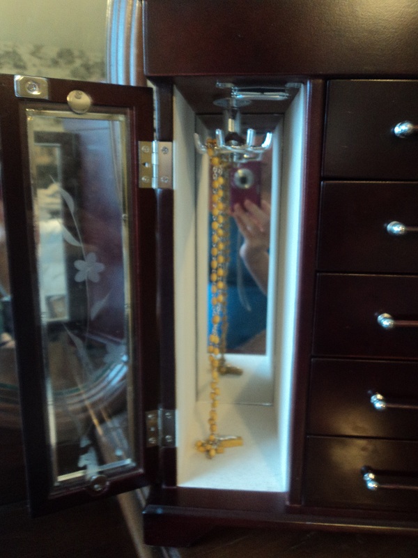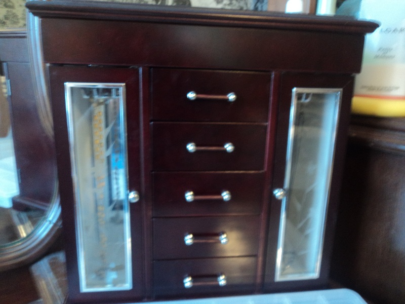 3.这个首饰盒尺寸算大的,非常新。我看到SEARS卖的很多比这个小,还不是实木的,都要六七十加币以上。这个首饰盒尺寸长宽都大约是一尺多点儿(形象点:一根黄瓜长的样子)。东西多,要精简啦。便宜卖了:$40