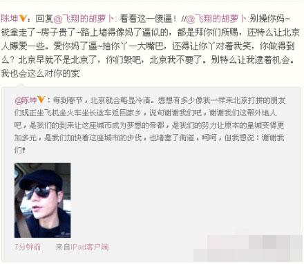 陈坤微博称北京人应感谢外地人 曝粗口与网友对骂