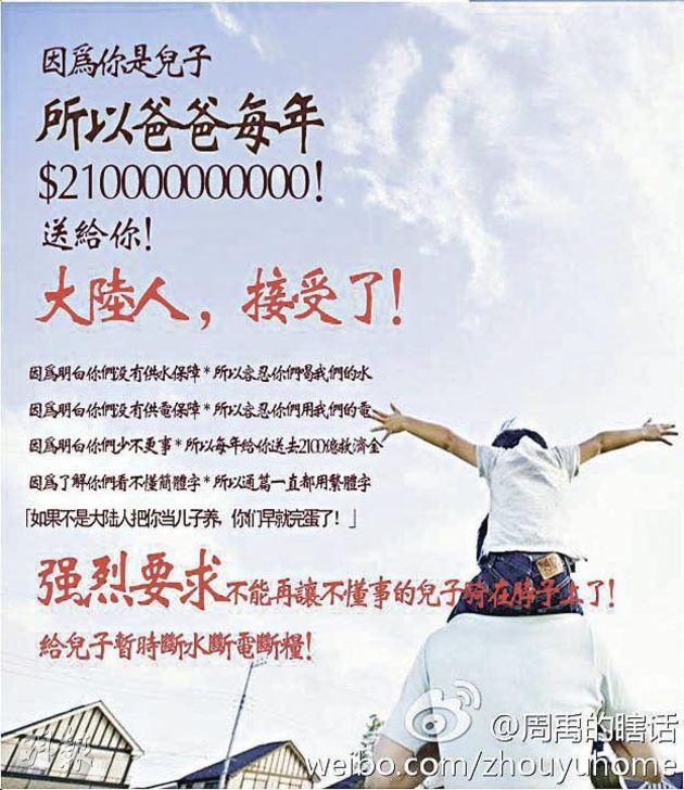 内地网民周禹昨在其个人社交网站张贴海报,指不少本港的供水供电也是由「爸爸」给「儿子」(即内地给本港),以反击本港网民的「蝗虫论」,随即被本港网民转载。他其后说,不少香港网民到他的网页只有「谩骂,没有反思」。(网上图片)