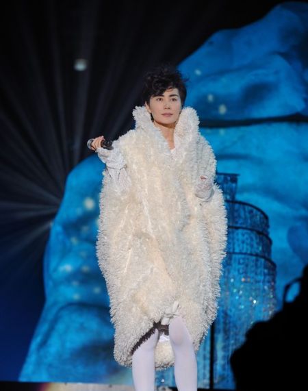 晚上8点13分,现场的灯光渐渐暗下去,宁静的舞台上只剩下红梅,枯枝,白雪。瞬间,蓝光、红光、绿光快速地划过舞台,一座冰山缓缓升上,几株晶莹剔透的玉树簇拥在旁边,天空中突然飘下雪花,《雪中莲》的歌声从冰山后穿出,空灵清透。虽然大屏幕出现了裹着如白雪般外套的王菲,然而放眼望去舞台上除了冰山,只有银树。所有观众都在眺望,都在寻找,只能看到冰山后若隐若现的身影。歌曲唱到一半,冰山裂开,王菲随着一只剔透的水晶麦克风架破冰而出。黑色短发,黑色眉毛,脸上没有再多色彩,洁白外套和水晶流苏的裙摆,看似最简单的颜色却凝聚了舞台上最浓墨重彩的焦点。此刻,雪花依然在天空飞舞,随之飞旋的还有台下观众的尖叫和歌声。