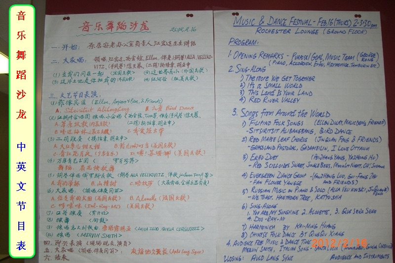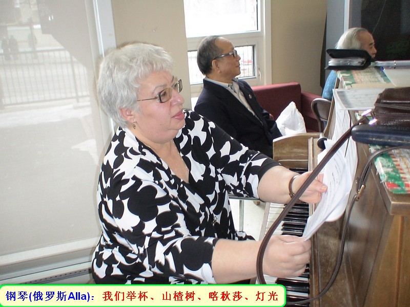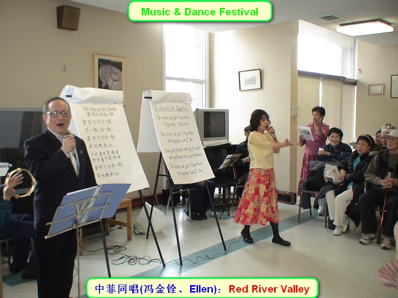 活动在江宏达、冯金铨和(菲)Ellen Dullay主持和带领大家唱开始,有我们华人熟悉的 “《当我们同在一起(The More We Ge Together)》、《红河谷(Red River Valley)》 和 《这片土地是你的(The Land is Your Land)》、《世界真细小(It's a Small World)》等世界经典名歌,随着钢琴、手风琴优美的伴奏旋律与英语、华语歌声和谐地混响一起, 迴荡着大厅。 表演节目由Ellen带领菲律宾小组合唱菲律宾民歌: 《Sitsiritsit Alibangbang(蝴蝶)》、《Bird Dance(鸟舞)》,歌声充滿着浓浓的东南亚风情厚味; 随后冯金铨带领红枫叶合唱团独唱内蒙古民歌 《草原牧歌》 (电影《草原上的人们》挿曲)和抒情合唱《我爱渥太华》,情真意切,表达了新老移民对美丽新家园---渥太华的真挚热爱之情;胡亚中、杨培章的二胡联奏, 除了演奏中国乐曲《大红枣儿甜又甜》、《春江花月夜》外, 还有《铃儿响叮当》和 《噢!苏珊娜》美国名曲;特别介绍一下俄罗斯女士Alla Vellikovski,她十五岁开始弹钢琴,故弹技非常熟练,她激情奏响几首大家耳熟能详的二战歌曲《我们举杯》、《喀秋莎》、《山楂树》,本来是由俄罗斯小组几位俄罗斯女士伴唱的,她们因故未到,就由冯金铨带领大家尽情用中俄文抒唱一番,显得驾轻就熟;因为旋律优美的俄罗斯歌曲对于祖藉中国的观众真是太熟悉不过了,他们说我们当年就是唱着俄罗斯歌曲长大的,一点不假。据悉冯老师曾于2005年和2006年曾率广卅喀秋莎合唱团在广州中山纪念堂大舞台分别与俄罗斯亚历山大军队红旗歌舞团和俄罗斯国防部红旗歌舞团同台演出,2007年7月又率团应邀回访俄团在莫斯科、圣彼得堡等地演出访问,与当地艺术家们联欢,受到热烈欢迎。