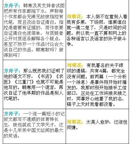 顺便表示下一个小疑问:如果老方揭露的都是事实,就等着韩寒自己现形好了,涉及那么多相关的人,很容易败露的,有了确凿的物证人证来对质,还怕韩寒抵死不认?总惦记着说服人,是不是有点虚的表现呀?:confused:倒像是搞竞选呢,拉选票好让新神代替旧神登上神坛。。。:p