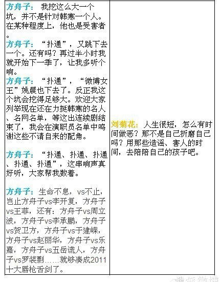 3月7日晨,微博疯传好事网友对比贴《刘菊花苦劝方舟子》 ,质疑方舟子对韩寒等人和对妻子刘菊花的双重标准。作为韩方大战的后传,且听下回分解。