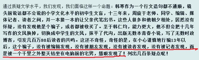 不知道钱钟书是否可以说是高产作家?他的长篇小说也就“围城”。不过,别人并没有质疑他们。韩寒如此被人质疑的情况下,况且有诸多不合常理的事,出来回应,是必须的。否则就是认输。也让我们见识一下“天才”是什么样的。我并没有预设立场,以外方的这次可能是走眼了,但仔细看过他们的大部文章,及韩寒的回应,我必须承认,走是方舟子最有意义的一次。时间将会证明一切。
