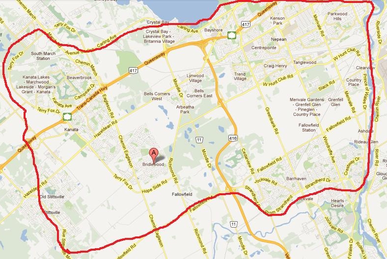 ★一套餐桌椅 (很新) 450刀 5月20几号送货 sold ★一盏落地灯 8刀 ★比较大的物件(必须用van运送),30刀以上,加2刀油费可帮送货,但是请先来看货,并确定要后,才可送。送货范围请看下图。 ★请QQH(悄悄话)联系 或 电话:613-287-1638(10:00Am -10M )