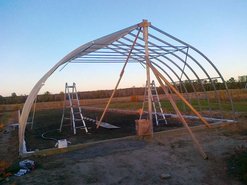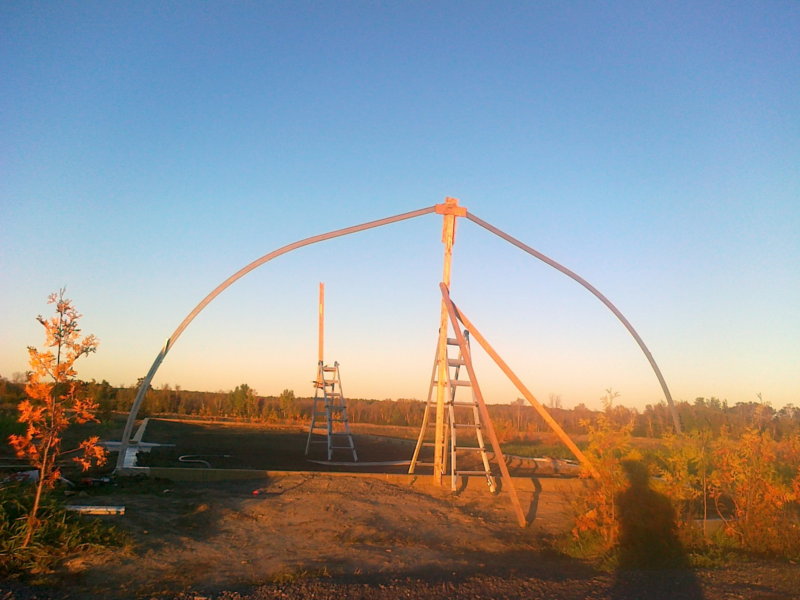 2013-09-28 昨天CITY的INSPECTOR验收完基础,今天开始搭第一对骨架。 一个人干活有点难,主要原因就是每片骨架都是弧型的,一个人在一端很难搞定另一端,需要再研究战法。 2013-09-29 今天风大,赶紧把第一组的连接、拉紧条都上齐了。一共8组,除第一组7对外,其他每组6对。 谁见过这么密的排骨条的? 2013-09-30 UPDATE 2013-10-01 国庆节继续 2013-10-02继续,今天有点腰疼,进展不大,看来还是过力了,悠着点儿劲吧!。 2013-10-09 一边儿的ENDWALL立起STUD,麻烦就在于中间还要给水平拉杆开个槽。 中间2根粗的是门框。 2013-10-10双十 今天来个大爷得吧近一个小时,双农业学位,我能听懂50%+。 2013-10-12 主体框架结束,剩下风口细布需要台锯,只能在家里加工好明天再装了。