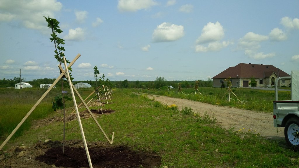 一个半月前挖了25个树坑,从上周末到本周末,我们两口子用了4天的时间把树种上了,共4个品种的枫树。我希望秋天是一侧腥红、一侧金黄的景象。