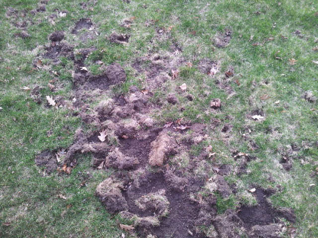 To measure whether or not you have grub problem, simply lift a one square foot section of sod with a spade. If more than 5 - 10 larvae are present, then you have a problem. The most effective way to control the grubs with with nematodes. It is best to apply them in late July to early August when the eggs are hatching and the grubs are immature. The nematodes, also known as Steinernema carpocapsae are a parasite of the grubs. They can be purchased at your local retail garden centre. A healthy lawn can support a few grubs per unit area and still survive. An unhealthy lawn will soon be destroyed by the grubs, particularly those of the European chafer beetle. The grub (the larvae of the beetle) feeds on the grass roots which kills the grass. Skunks, raccoons, starlings and even squirrels can dig up the area completely while feeding on the grubs. The good news is that they are reducing the grub population. The bad news is that they don't get them all - some hatch (in early June) and mate and come back later in June and July and lay eggs in the soil. By the end of July, these eggs are hatching to start the cycle all over again