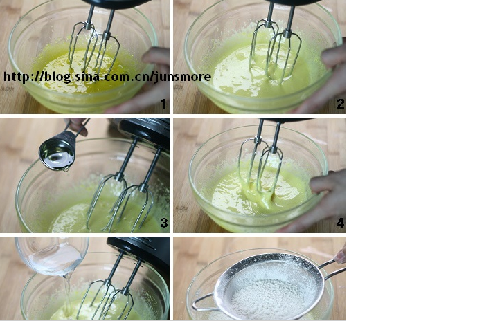 制作过程: 1、首先制作戚风蛋糕。先将鸡蛋的蛋黄和蛋白分开。盛蛋白的碗需要无油无水。把蛋黄和细砂糖混合后用打蛋器打发。 2、如图所示,蛋黄打发到体积膨大,状态浓稠,颜色变浅。 3、分三次加入玉米油(或葵花籽油等无味的植物油)。每加入一次都用打蛋器搅打到混合均匀再加下一次。 4、加入完玉米油的蛋黄仍呈现浓稠的状态(这一步即是蛋黄与油的乳化)。 5、加入水(或牛奶),轻轻搅拌均匀。 6、低筋面粉和泡打粉混合后筛入蛋黄里。