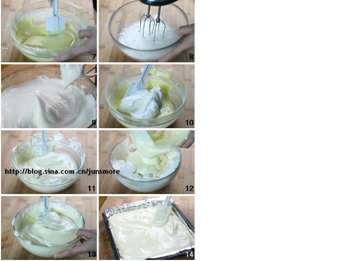 心 心缘----祈 一花 一世界 VIP 注册 2012-05-29 消息 999 荣誉分数 1,476 声望点数 203 2012-11-12 #208 7、用橡皮刮刀翻拌均匀,成为蛋黄面糊。将拌好的蛋黄面糊放在一旁静置备用。 8、将打蛋器洗干净并擦干以后,开始打发蛋白。将蛋白打发到鱼眼泡状态时,加入1/3的细砂糖。 9、继续搅打,并分两次加入剩下的糖。最终将蛋白打发到湿性发泡的状态(提起打蛋器后,蛋白拉出弯曲的尖角) 10、盛1/3蛋白到蛋黄碗里,翻拌均匀(从底部往上翻拌,不要画圈搅拌)。 11、再盛1/3蛋白到蛋黄碗里,继续翻拌均匀。 12、将拌匀的面糊倒入剩余的蛋白里。 13、再次翻拌均匀即成戚风蛋糕面糊。 14、把面糊倒入铺了锡纸或油纸的烤盘,抹平,并用力的震几下,让面糊内部的大气泡跑出。把烤盘放入预热好180度的烤箱,烤15-20分钟,直到表面金黄色。 附件 Untitled.png 482.2 KB · 查看: 49