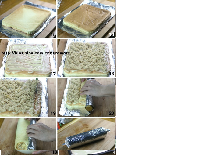 心 心缘----祈 一花 一世界 VIP 注册 2012-05-29 消息 999 荣誉分数 1,476 声望点数 203 2012-11-12 #209 15、准备一张新的锡纸或油纸,把蛋糕倒在上面,趁热撕去蛋糕上的锡纸或油纸。此时蛋糕底面朝上。 16、待蛋糕稍冷却后,把蛋糕翻过来,使表面重新朝上。 17、在蛋糕表面抹上一层沙拉酱。咱自家做的话,当然更推荐用自制沙拉酱啦(点击进入做法) 18、在蛋糕表面洒满肉松。 19、在准备卷起的一边,先用刀在如图所示的位置上切一刀,但不要切断。这样一会儿卷的时候更方便。 20、开始卷了。注意一下手法哈。拿一根擀面杖绕在锡纸上。擀面杖往后卷,同时将蛋糕卷往前推。 21、一直卷到头。锡纸都绕在了擀面杖上,而蛋糕卷也成型了。这样卷起来的蛋糕卷一是省力,二是不容易断。用油纸的话也是同样的卷法。 22、最后,用锡纸或油纸把卷好的蛋糕卷包起来,两端拧成糖果状。放入冰箱冷藏半个小时定型后,即可切开 附件 Untitled.png 379.2 KB · 查看: 52