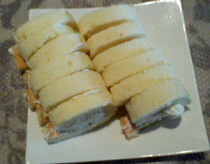 分享一份今天新学会做的奶油蛋糕卷(原为肉松蛋糕卷)(是朋友现场指点我),因为是第一次做,所以外形不是很漂亮,但孩子真的很爱吃! 【肉松蛋糕卷】(参考分量:11寸方烤盘一盘) 配料: 戚风蛋糕配料:鸡蛋4个,低筋面粉80克,细砂糖60克(加入蛋白),细砂糖20克(加入蛋黄),玉米油50克,水50克,泡打粉1/2小勺(2.5ML) 夹馅配料:沙拉酱100克,肉松100克