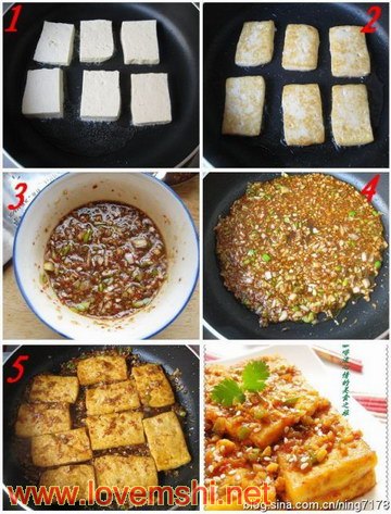1.将豆腐切成1CM厚的大片,用油煎至外表金黄,盛出备用。