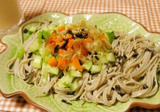 wu99 崇拜鸭丫--鸭丝 VIP 注册 2012-04-30 消息 6,455 荣誉分数 3,045 声望点数 223 所在地 五浊恶世 2015-08-05 #859 用料 荞麦面、黄瓜、胡萝卜、柴鱼片、海苔、熟白芝麻、冷面汁(万字酱油)、寿司烧汁 做法 1.先准备好冰水备用,然后烧一锅开水,水开放入适量荞麦面,转中火煮十分钟左右~ 2.在煮面的时间里,把黄瓜胡萝卜切丁,海苔和柴鱼片撕碎一些~