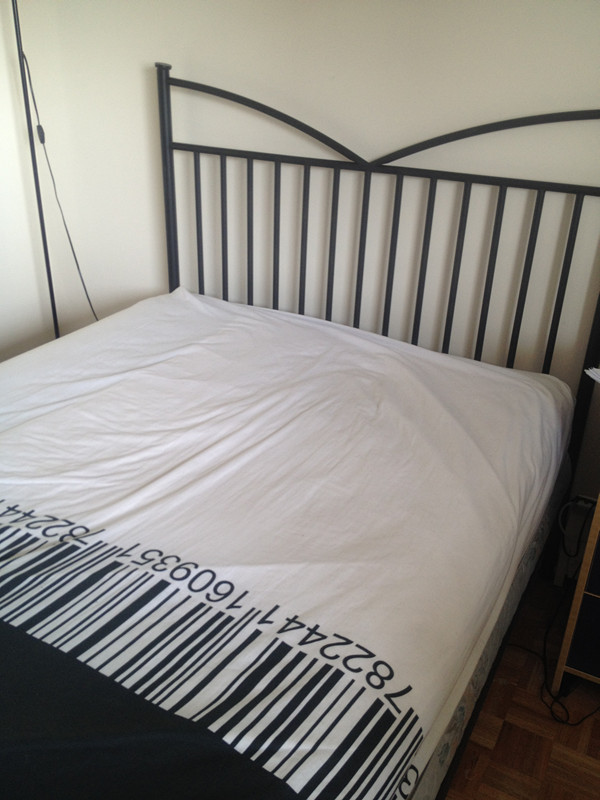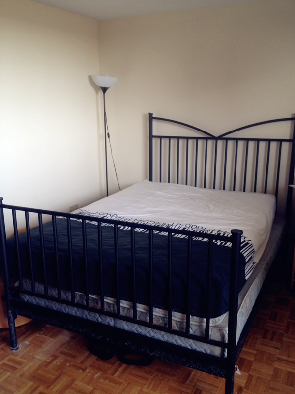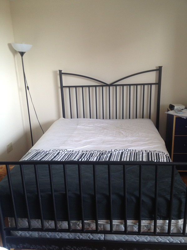卖双人床一个,此床最大的优势是方便安装与拆卸,完全嵌入式安装,无需螺丝固定,但极其稳固,外观设计也很大气,床架为铁质,不易着虫,床垫为上下两层。 具体样式以下列图片为例,有意的可以留下QQH或者联系方式, 价格面议。。。。(SOLD)