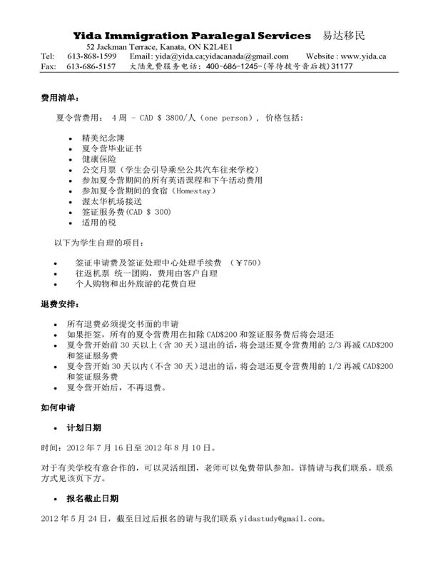 [FONT=宋体]易达移民和加拿大教育局国际学生部合作,邀请您在今年暑假来参加2012留学预备夏令营,探索加拿大美丽的首都。在这里,你可以[/FONT][FONT=宋体]了解熟悉加拿大的文化,选择住在加拿大房东的家里,游览加拿大的著名景观,学习英语,开拓视野,也为将来毕业出国留学做一个很好的准备。家长也可以一起陪同参加。为期一般从2个星期到4个星期不等,时间一般从7月15-8月10。[/FONT]