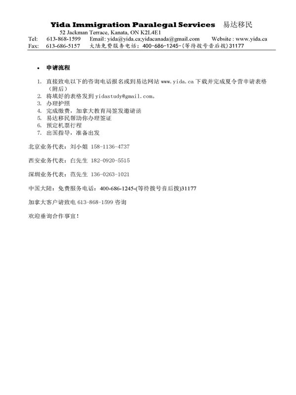 [FONT=宋体]夏令营名额有限,请有意的朋友尽快与国内的亲友联系,确认报名事宜。详细的夏令营招生简章请浏览www.yida.ca[/FONT]