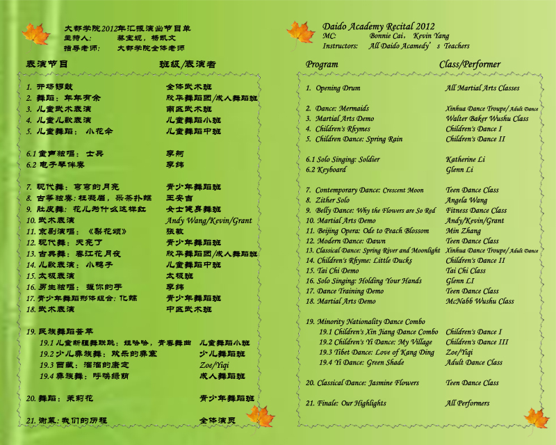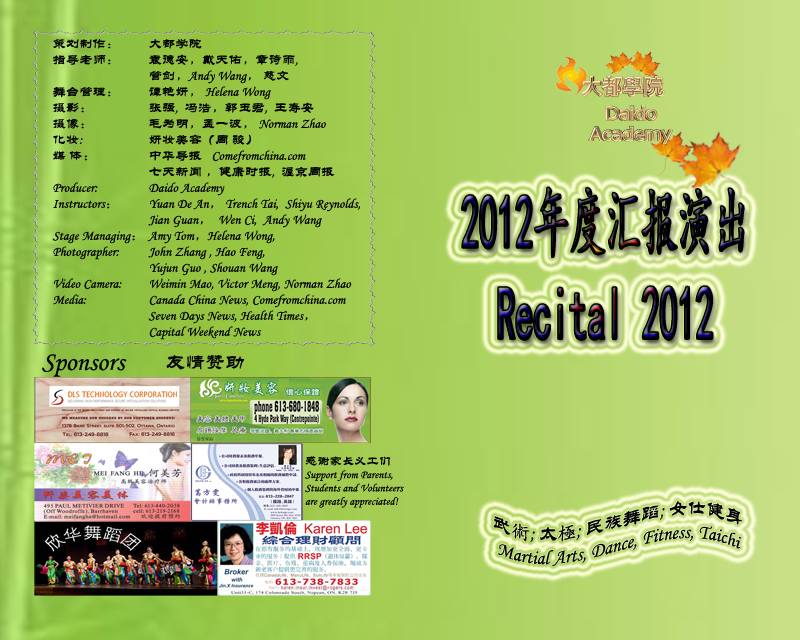 大都学院2012年度汇报演出将于本周日五月二十七日下午举行,除了精彩的武术,舞蹈,演唱,器乐表演外,我们还有食品糕点义卖,幸运抽奖,服务设施和商品展览和介绍,欢迎大家前来观看参与。