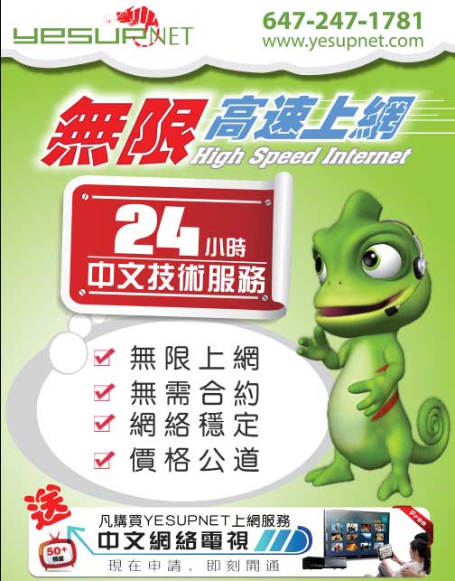 YesUpNet隆重推出經濟實惠Economic 6M高速上網 80G流量網絡,無需合約,還有24小時中文服務 讓您的口袋,在夏天裡,也清爽一下 現在訂購,還送6個月免費高清中文網絡電視 YesUpNet,給力一 “夏”, 還等什麼,這可是全城最低價哦** 馬上撥打電話647-247-1781,讓您的夏天,更輕鬆 ** 同等產品及計劃 ***YesUpNet高速互联网DSL服务范围覆盖安大略省和魁北克省。