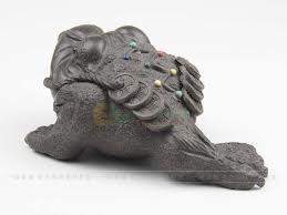 另一种比较受宠爱的茶宠是金蟾。这蟾蜍并非普通蟾蜍,它拥有三只脚。传说它本是妖精,后被刘海仙人收服,改邪归正,四处帮贫人,吐钱给人们,所以后来被人们当作旺财瑞兽。金蟾所到之处,金钱集聚之地。金蟾是金钱的谐音,“旺财金蟾”身上背着的是“钱串子”,就是金钱一串一串地进家门的意思。