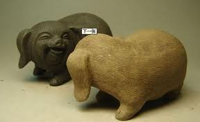 猪历来是富足、祥瑞的象征。所以把它养在茶盘上非常可爱,也很招人喜欢。一般养单个的,可以买比较大的,但也有一对的。所以分为阴刻和阳刻,即有的出头出脚出尾巴,有的则全在砂石的刀功上反映喜怒哀乐。何况2007年是猪年,我们中国人都喜欢应景,因此金猪献瑞该有多好呢!