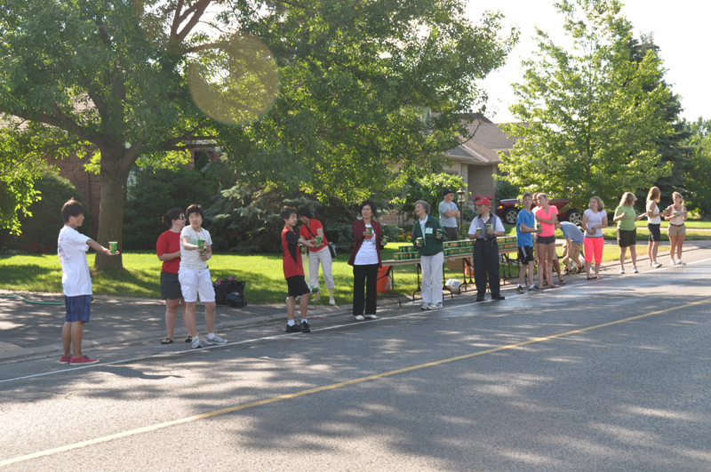 七月一日早晨kanata的健跑运动员拉开了Kanata社区庆祝国庆节活动的序幕,六点三十分,当社区里大部分人们仍然在梦乡里的时候,有一群义工为了要服务“Kanata 10公里 马拉松跑步”的运动员,早早就已经各就各位在10公里的路径上布置供水站,架设桌子,往大水桶里注水,装满几百个水杯,堆叠的水杯子,摆满了三个长桌,放到长桌子上预先准备好,。。。。七位来自华裔老年支助中心的朋友们,在89 Knudson Drive供水站和其他义工们一起为选手们送水、加油,场面温馨、热情、感人。