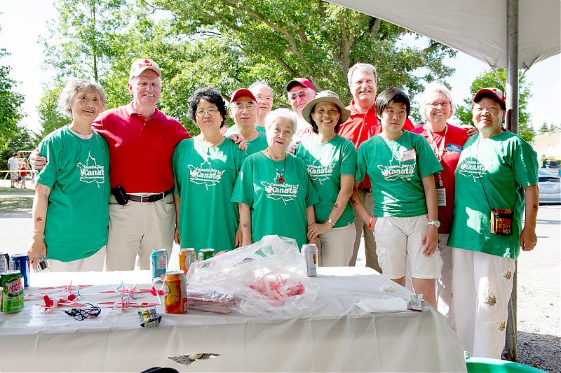 早餐会在11:00左右结束,然后我们继续留下当义工,帮忙Kanata国庆活动的顺利进行。大家先向大会当场报名,填写义工登记表,穿上绿色的义工T恤衫,执行义工任务。我们今天的工作是为大会担任“卖水,饮料和国庆纪念手环及小飞机玩具“。春艳是”掌柜的负责管钱,年轻的小今晨是漂亮的柜台服务员,负责回答顾客的问题,玉英、佩珍二位外婆们负责递水、饮料;身穿义工衣、头戴时装帽的林奶奶是最俏的“场内销售员”,为了为大会募款,拿着手环不断的重复“one dollar each”,秀珠是最受欢迎的”亲善大使,分送免费的国旗别针,与大众结下一份欢喜缘。。。,艳阳下这些白发的华裔老年义工队特别引人注目,市长、参议员、省议员和市议员多次来到服务点看望,表示关心和感谢,他们也得到了大会的赞扬,在下午五点的正式开幕式中向现场的来宾介绍他们的参与,并希望社区里的老年朋友以他们为榜样向华裔老人学习。