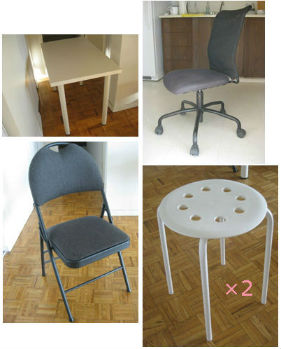 IKEA 小桌,一把转椅,2个stools + costco的靠背椅 $20