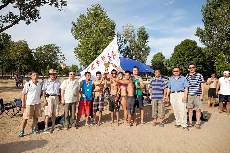 比赛结束之后,组委会在沙滩上举行了简短而热烈的发奖仪式。中国驻加使馆教育公参张兰春,校友会现任和前任主席王永智和李世友分别为冠,亚,和季军队颁发了奖杯和奖牌。参加本届比赛的八支球队在新赛制下本着友谊第一的精神,比技术,比体力,和比参赛技巧,每队赛完6场比赛。各队在收获排名的同时也增进彼此的友谊。