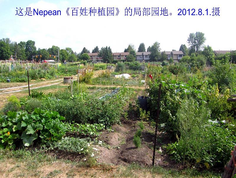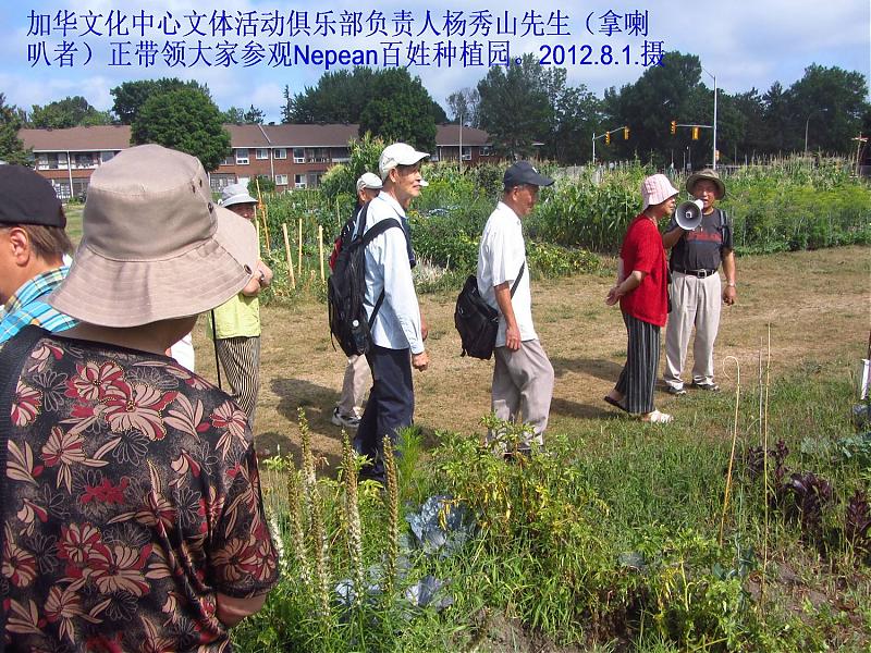 2012年8月1日上午9点半~11点,加华文化中心文体活动俱乐部组织全市爱好种植者参观位于Nepean的”百姓种植园“。该菜园有200多块耕地,大块约60平米,小块约30平米。土地由政府提供,组成菜地管委会管理,供百姓申请租用种植。老年人租用25元/ 年,菜地管委会提供水、工具、简易肥料、春秋翻地等。租用户来自各族裔,种着自己喜爱的蔬菜。前去参观者由30余人,由文体俱乐部负责人杨秀山先生带领大家边参观边讲解,大家参观兴趣很浓,边参观、边拍照、边记録,开了眼界,增长了见识,收获颇丰。下面附上参观照片。