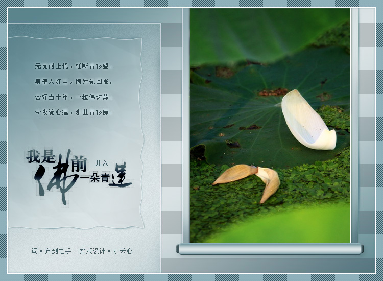 我是佛前的一朵青莲,沐浴着清幽的梵唱,静静的微绽在忘忧河上。几乎静止的河水清澈明晰。佛说,忘忧河映射出的,便是人世间的喜怒哀乐。于是,我常常看着那些男男女女,笑着,哭着,开心着,忧伤着。我不明白,为什么他们总是笑的时候少,哭的时候多,开心的时候少,忧伤的时候多。我问佛,佛爱怜的对我说:人生在世就是一种修炼,只有看破红尘之后,才能大彻大悟。我还是不明白,佛说我不需要明白。更多的时候,我就静静的微绽着.....