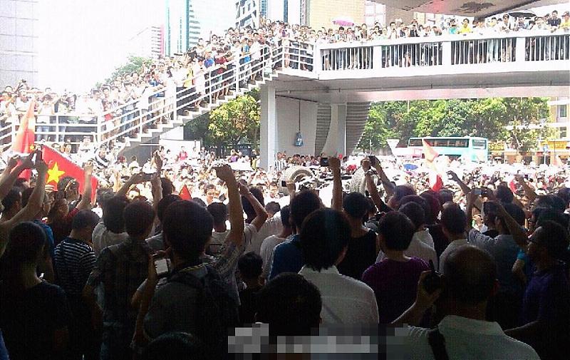 昨早10时许有民众冒雨游行,从西安城南的小寨、纬二街、长安路由南向北,往市中心钟楼方向游行。视频显示,示威民众挥舞中国国旗,高举「誓死捍卫祖国海域」、「宁可大陆不长草,也要收复钓鱼岛,哪怕华夏遍地坟,也要杀光日本人」等标语,又在地铁站内挂上反日横额。人群一度聚集在西安市地标建筑古钟楼之下,高叫「日本滚出钓鱼岛」的口号及唱国歌。 网