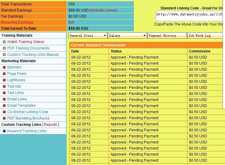 这个工作不能让你赚大钱,但是500-5000的额外收入不是不可能。本人刚加入这个公司两天,很多东西都不懂的情况下,我赚到了87块。我是家庭主妇,在一次偶然的情况下看到加拿大老外的招聘报纸里有这个工作。有兴趣会基本英文的朋友可以考虑。看图我这两天的收入。
