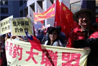 大温侨团的保钓示威抗议运动,两岸旗帜同时出现,不管两岸三地哪里来的移民都有参加。