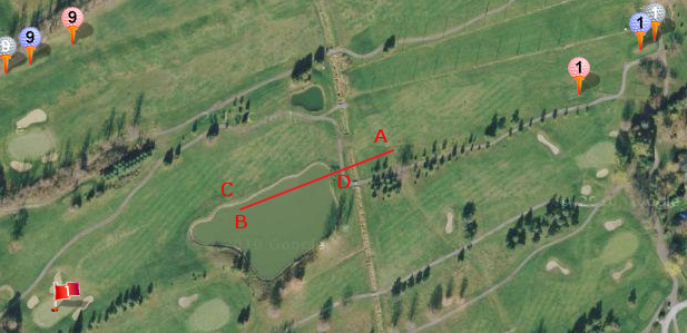 Manderlay Central 第1洞,打第2杆时,前方左面有水塘。如果在A点打球,进入水中在B点溅起水花,我看到不止一人在C点抛球打第4杆。请问是否符合规则?我自己在D点抛球,是否没有充分利用规则?