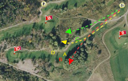 1、黄线球员slice打入右边树林。有人在A点抛球,还有人在D点抛球!