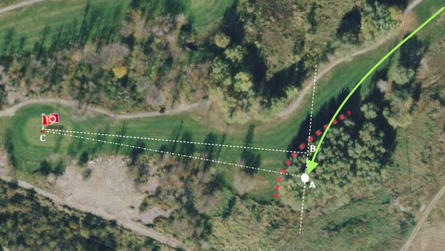 3、绿线球员超级slice从右边树林前面打入树林,在C点抛球。