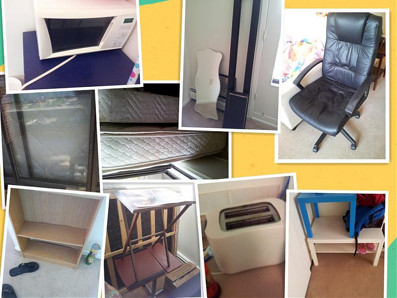 8.5成新微波炉 40元 宜家全新穿衣镜10元 宜家书架 20元 9成新皮质转椅 50元 Queen size 床+box 是比较硬的 80元 小书架 10元 电脑桌,可以在床上用的15元 烤面包机 5元 蓝色小桌子9成新 10元 白色大桌子 15元 电饭锅 10元。送碗 非诚勿扰 住在230 woodridge , bayshore 附近