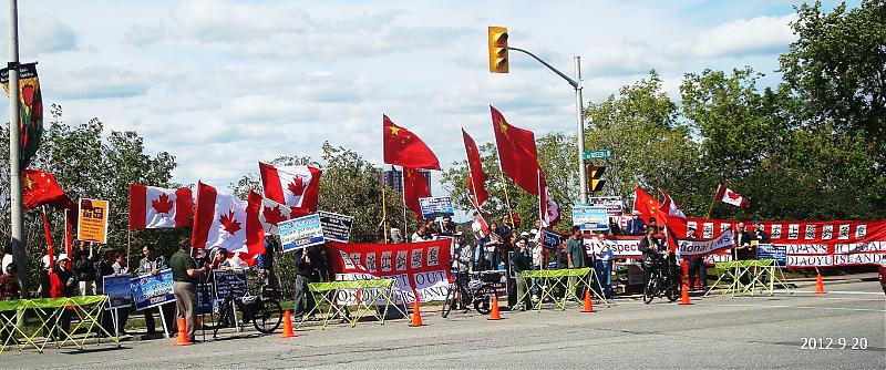 渥太华十三个社团于九月二十日中午,在日本驻加大使馆前, 举行了阵营宏大,声势激昂的抗议示威活动。强烈谴责日本政府阴谋将中国领土钓鱼岛及附属岛屿“国有化”的非法行径。