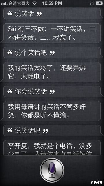 开喜 初级会员 VIP 注册 2003-08-12 消息 8,184 荣誉分数 1,052 声望点数 323 2012-09-29 #5 看看李开复是怎么调戏Siri的, 呵呵. 附件 image-2390644868.jpg 122.1 KB · 查看: 525