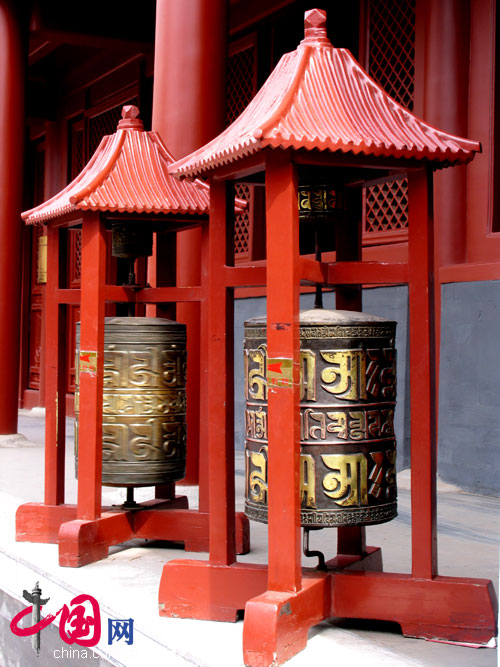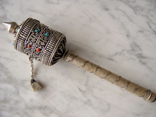 转经筒又称祈祷筒、嘛呢轮是在中国藏传佛教寺院周围都装置有一批可依次转动的经轮。一般用布、绸、缎、牛羊皮包裹,也有用木、铜制成的。其表记刻有六字真言,筒内装满经典。依据藏传佛教的教证,凡转动经筒一回,等于诵读了一遍内藏经文。转经筒与六字真言(六字大明咒)有关,藏传佛教认为,持颂六字真言越多,越表对佛的虔诚,可得脱轮回之苦。因此人们除口诵外,还制作“嘛呢”经筒,把“六字大明咒”经卷装于经筒内,用手摇转,藏族人民把经文放在转经筒里,每转动一次就相当于念颂经文一次,表示反复念诵着成百倍千倍的“六字大明咒”。有的还用水力、灯火热能,制作了水转嘛呢筒、灯转嘛呢筒,代人念诵“六字大明咒”。藏区大大小小的寺庙门前,还有一排排在的转经筒,下端有可用于推送摇动的手柄,人们经常会到寺庙推动经筒旋转,称为转经。