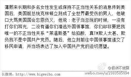 J jerrya00 知名会员 注册 2005-12-13 消息 93 荣誉分数 0 声望点数 166 2012-10-01 #2 唉,国人为啥总是对下半身的事,特别是名人的下半身之事有着异乎寻常的性趣?!米国人揪住小克的事是因为他撒谎。无人对谁是Lewinsky感半毛性趣!